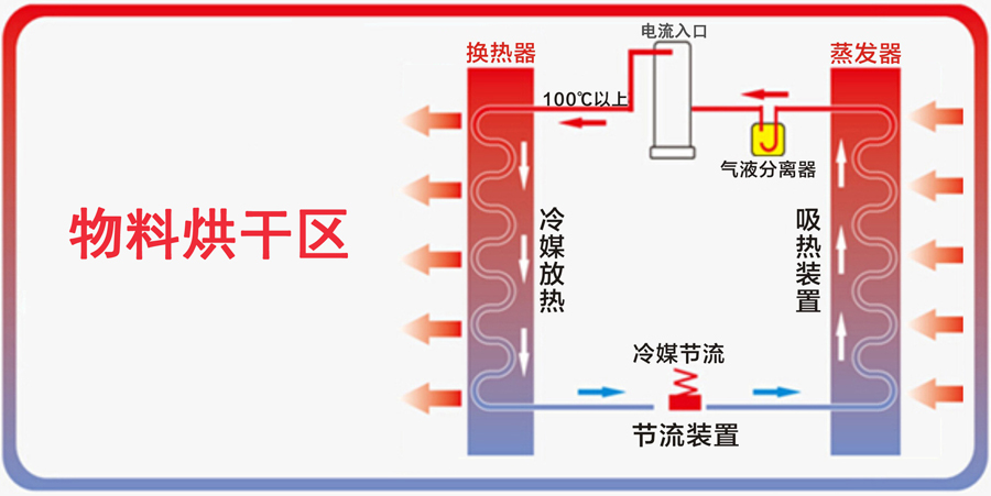 冷媒在压缩机的作用下在系统内循环流动。它在压缩机内完成气态的升压升温过程(温度高达115℃),它进入内机释放出高温热量加热烘干房内空气,同时自己被冷却并转化为流液态,当它运行到外机后,液态迅速吸热蒸发再次转化为气态,同时温度下降至零下20℃-30℃,这时吸热器周边的空气就会源源不断地将热量传递给冷媒。冷媒不断地循环就实现将空气中的热量搬运到烘干房内加热房内空气温度。